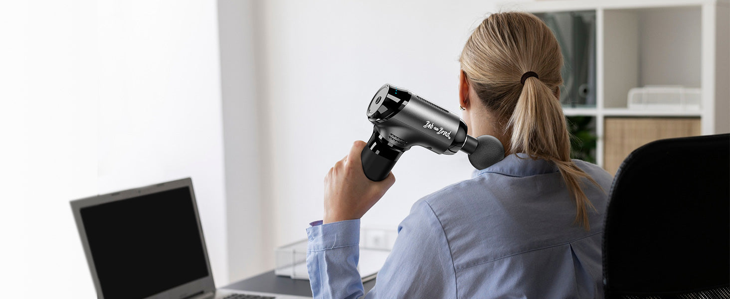 - QUIET and PORTABLE MASSAGE GUN - Our handheld massage gun provides you with a quiet massage as its working noise is only 45dB. It’s easy to hold with its ergonomic silicone handle design. Its compact size and case make it easy to carry around and use at work, the gym, and any other places you go.