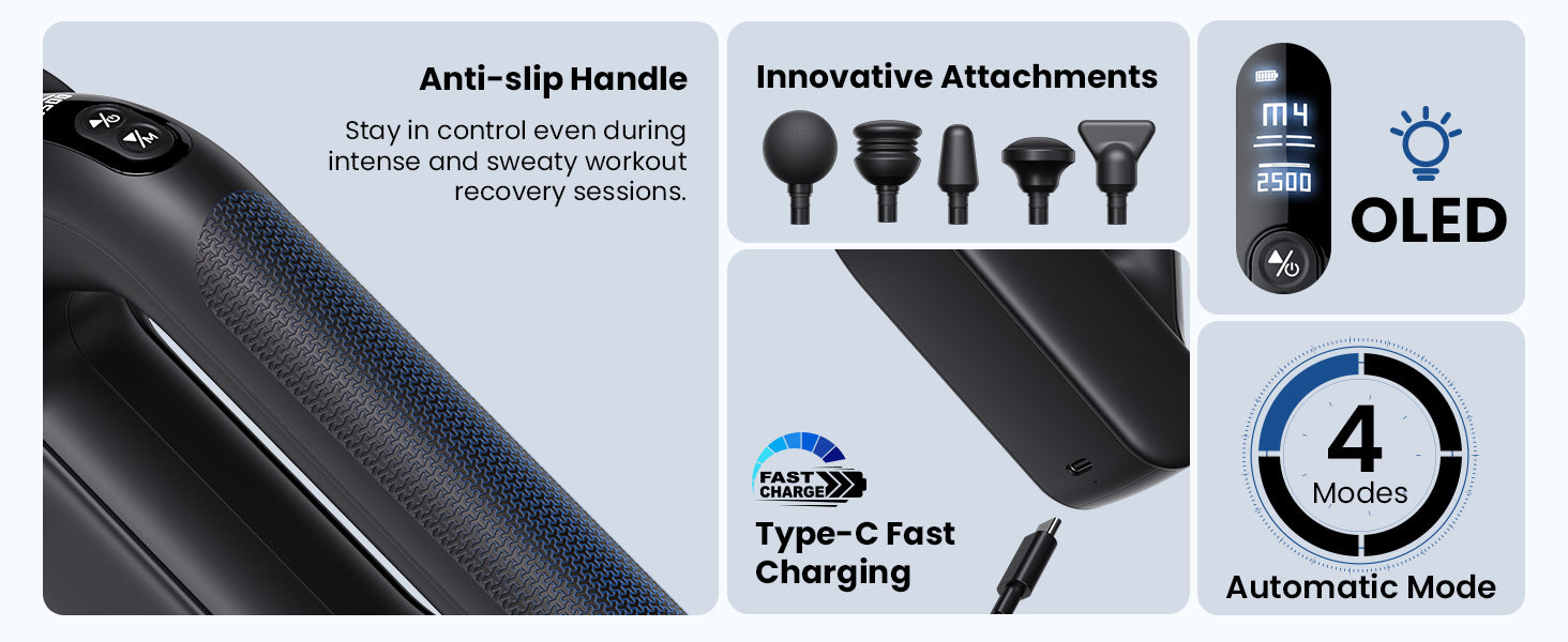 The Bob and Brad D5 Pro Massage Gun offers powerful deep tissue relief with 60% more power and a professional-grade 55 lbs. stall force, targeting knots and soreness effectively. Its D-shaped ergonomic design provides multiple grips for comprehensive self-massage. Navigate through 4 dynamic modes and 5 speeds (1500-2500 RPM) via the intuitive OLED display, ensuring tailored therapy for muscle recovery, performance enhancement, and relaxation. Operates quietly at 51 dB and boasts up to 4 hours of battery life per charge, making it ideal for uninterrupted use and portability.